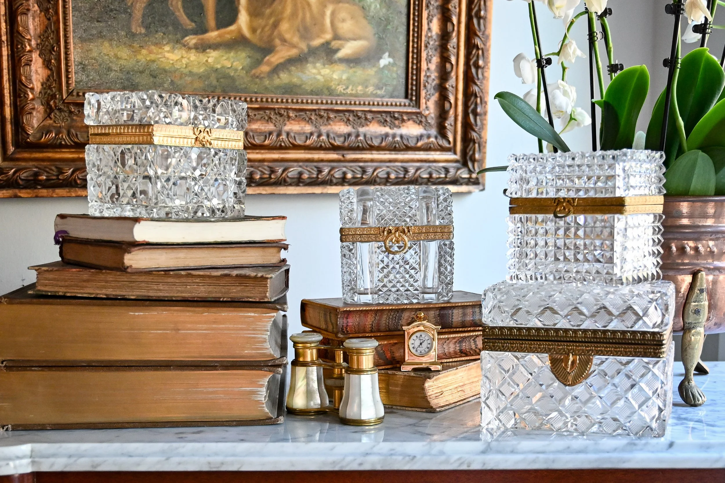Antique crystal caskets with ormolu mounts, styled with vintage books and opera glasses, photograph by Park Avenue & Co.